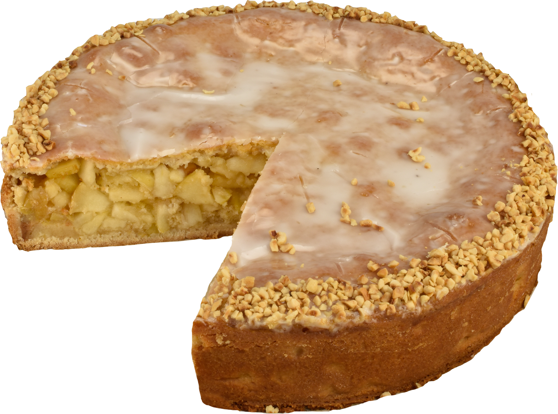 Ein knuspriger Mürbeteigboden gefüllt mit einer süß-saftigen Apfelfüllung und liebevoll gedeckt mit einer Zuckerglasur und gehackten Nüssen.
