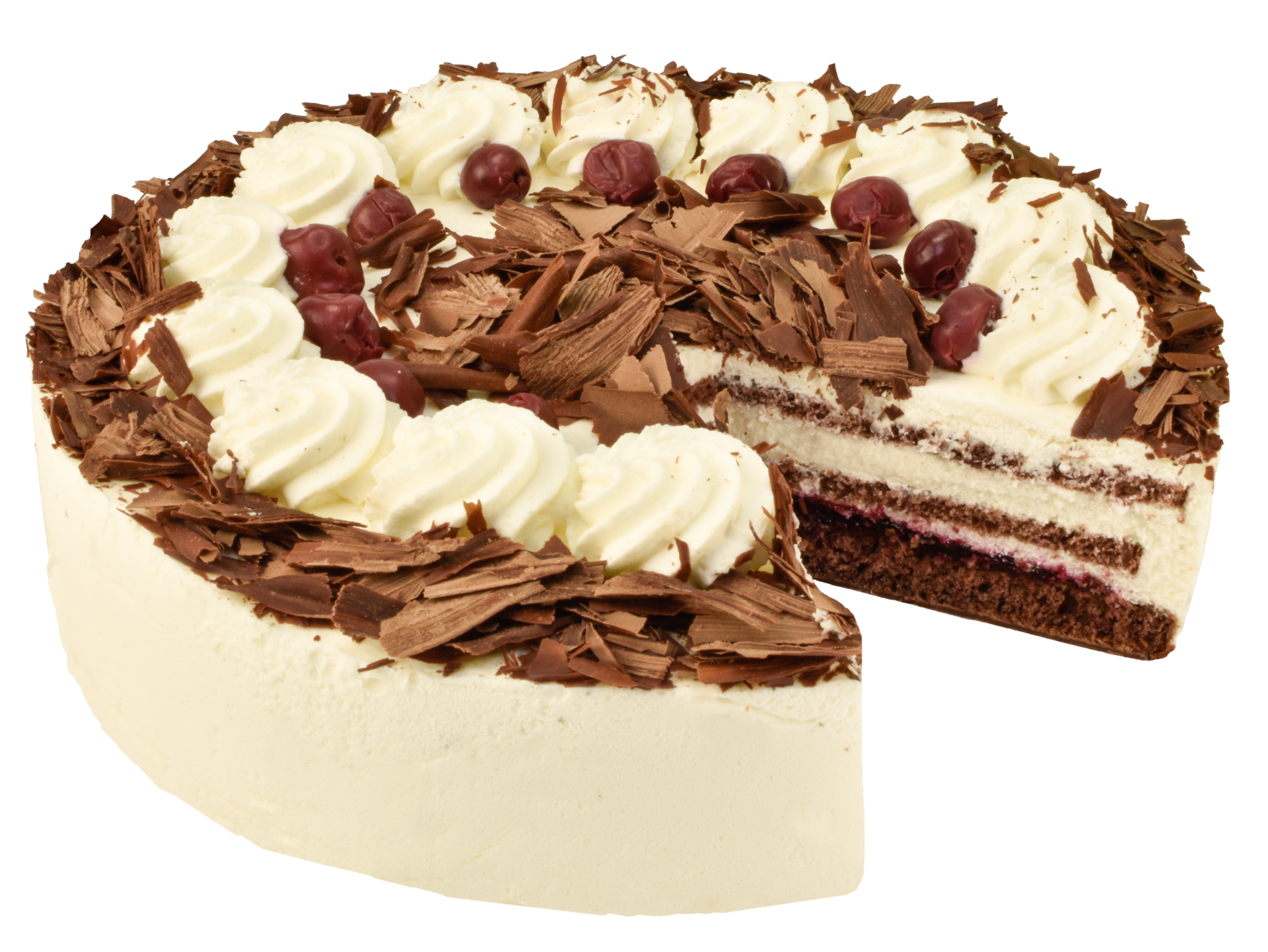 Schokobisquitböden bilden die Grundlage für eine mit Kirschwasser aromatisierte Sahne und Amarena-Kirschkompott. Schokoraspeln und Sauerkirschen vollenden die Torte